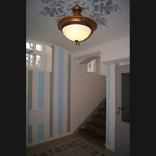 In Anlehnung an die alten Formen entwarf ich die neue Gestaltung des Hauses. Die Treppen und Gänge sind Zitate der historischen Ausmalung, der Wellnessbereich und die Hotelzimmer bewusst modern gestaltet. In den Zimmern soll man in eine „andere Welt“ treten. (Bild 10)