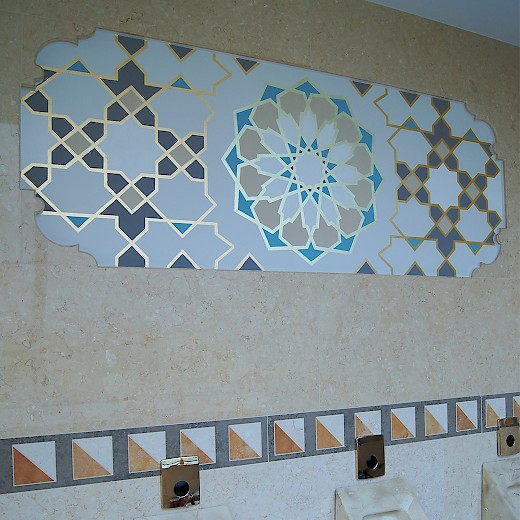 Ich zeige Ihnen hier einige Details eines von mir gestalteten Firmensitzes in orientalischem Stil. Eigentlich kein Wellness-Projekt, doch die Ornamentik und Gestaltungen würden wunderbar in ein orientalisches Spa- und Wellness-Design passen. Die Gold-Ornamente sind in Rosenobel-Doppelgold (23 ¾ Karat).
